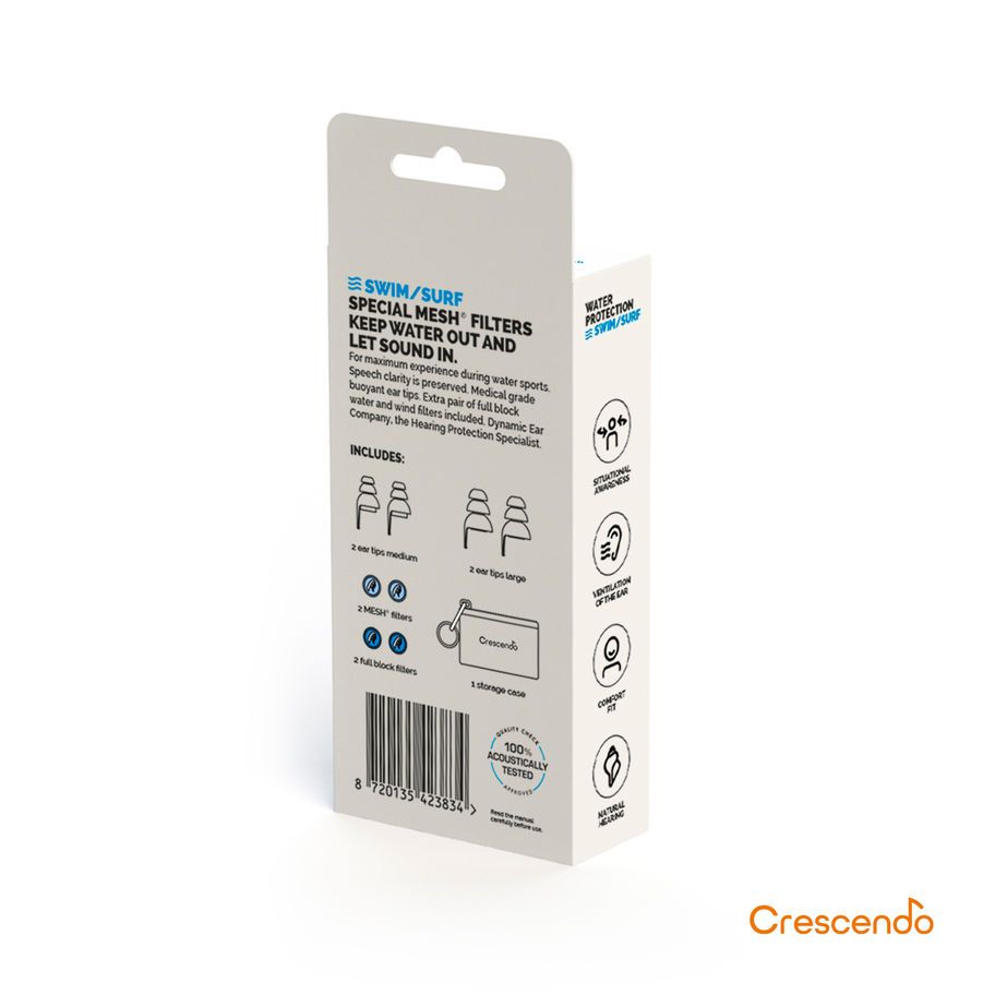 Designed to provide to the wearer the best experience during water sports, swimming and other water related activities. Speech clarity is preserved, whilst ensuring that large amounts of water are not permitted into the ear canal. This product includes medical grade floatable ear tips in multiple sizes to ensure that a tight seal in created in the ear canal as well as an extra pair of full block water and wind filters.